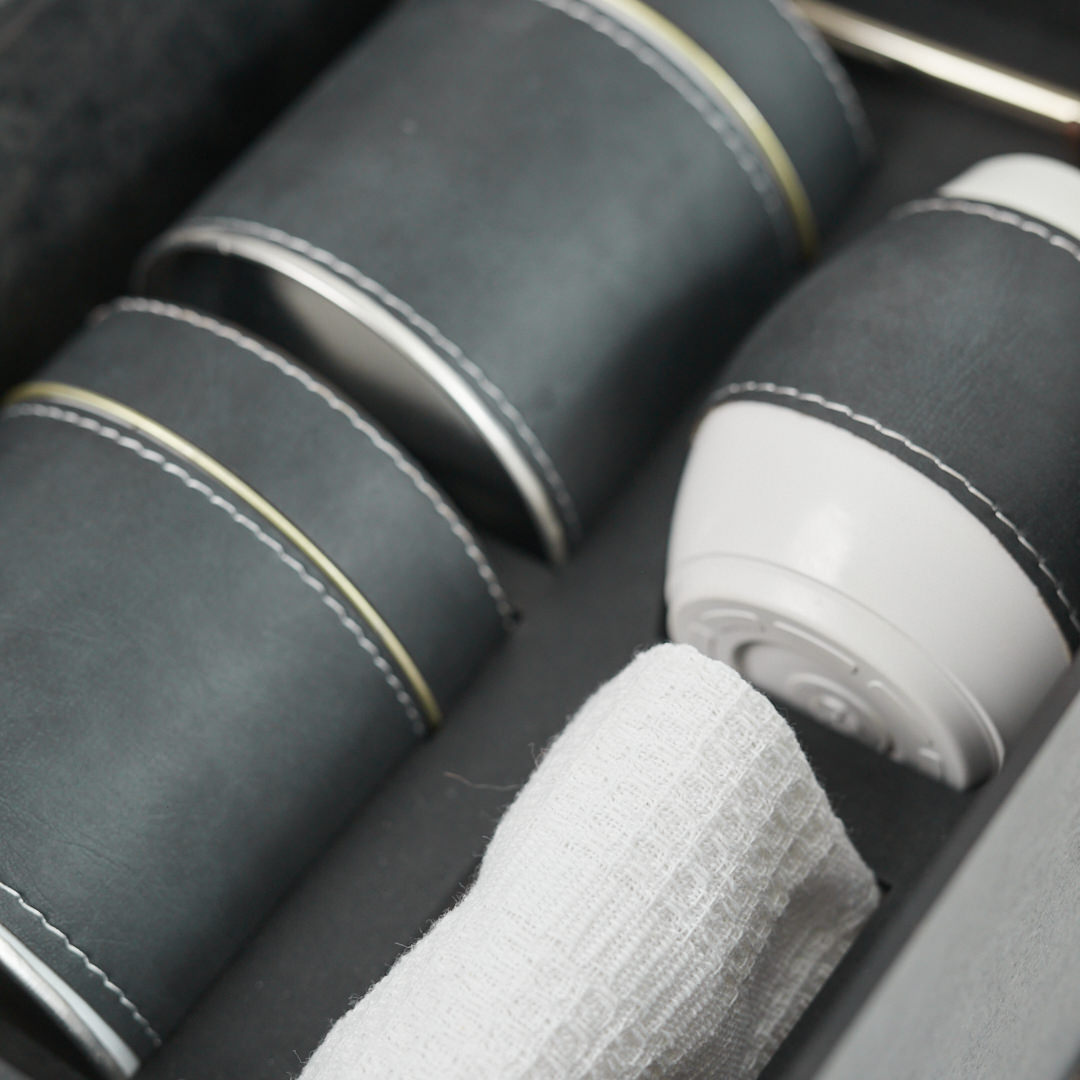 - 2 Latas de 8 cm. con pico vertedor. Lata y tapa forradas en ecocuero. Costura reforzada.