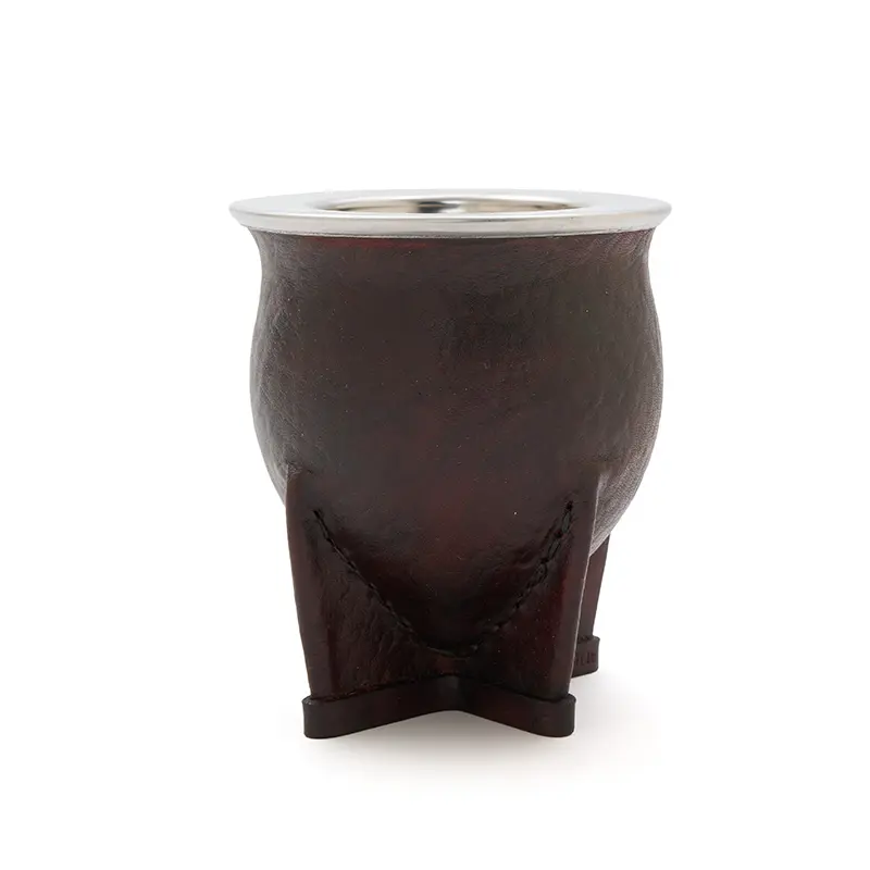 Descripción general del producto: Mate de calabaza tipo camionero moldeado en cuero vacuno con aro de acero inoxidable pulido espejo. Es ideal para uso diario, campañas institucionales o packs promocionales. Incluye bombilla pico de loro y una bolsa de algodón de 20 x 20cm.