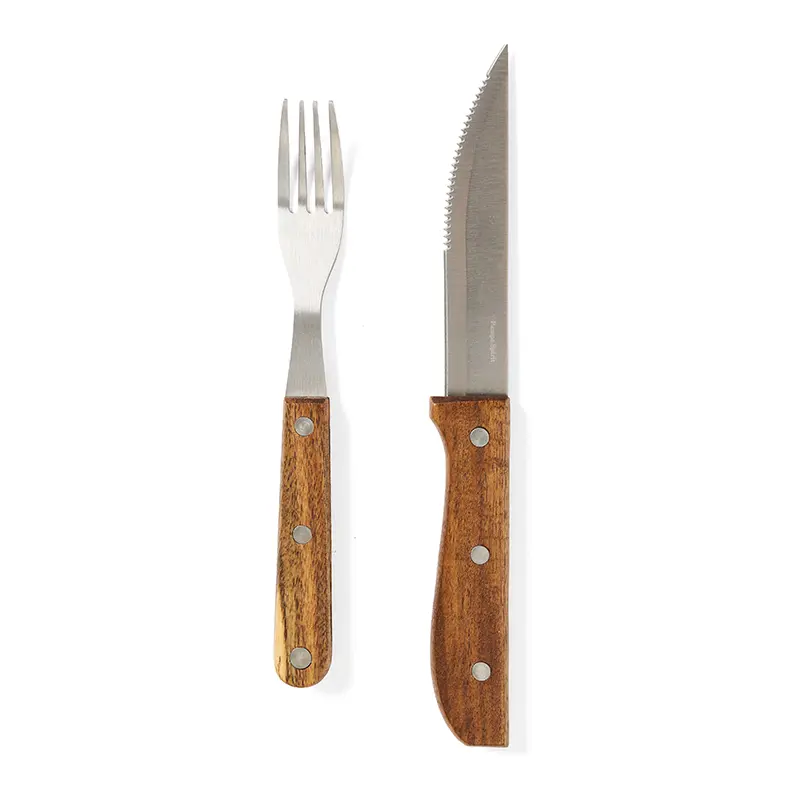 cuchillo y tenedor de acero con mangos de madera, y soporte metálico