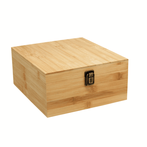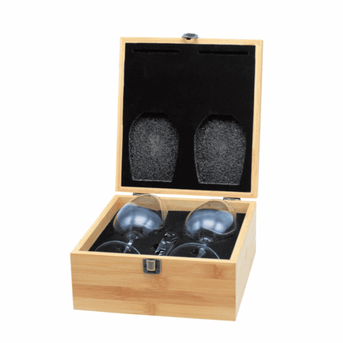 Set de vino en caja de bambú con herrajes metálicos. En su interior trae dos copas de vino y un destapador metálico de dos tiempos de acero inoxidable. Incluye espuma protectora donde encajan las piezas para su guardado y traslado.